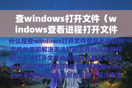 查windows打开文件是我们日常使用电脑时经常会遇到的问题。在使用Windows系统时,打开文件是非常常见的操作,但是有时候我们会遇到无法打开文件的情况,这时候我们就需要查找原因并解决问题。本文将针对查windows打开文件的问题进行详细介绍。