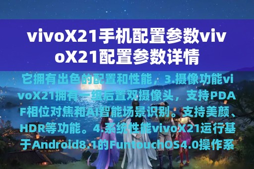 vivoX21作为一款高端智能手机,其配置和性能都非常出色。它的全面屏设计、高通骁龙660AIE处理器、双摄像头等功能都为用户提供了更加优质的使用体验。如果你在寻找一款性能强劲、外观时尚的手机,vivoX21绝对是一个不错的选择。