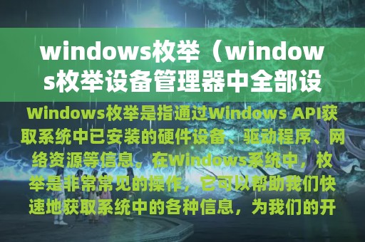 Windows枚举是指通过Windows API获取系统中已安装的硬件设备、驱动程序、网络资源等信息。在Windows系统中,枚举是非常常见的操作,它可以帮助我们快速地获取系统中的各种信息,为我们的开发工作提供了很大的便利。