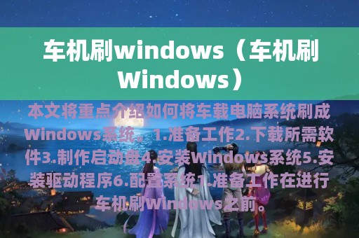 刷车载电脑Windows系统需要准备好各种材料和软件,制作启动盘,安装Windows系统,安装驱动程序,最后进行系统配置。刷机过程需要谨慎操作,以免造成不必要的损失。