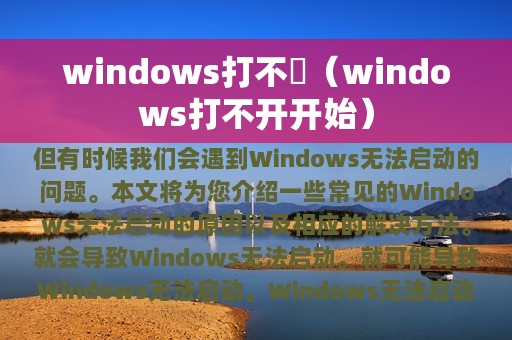 Windows是我们日常生活中使用最广泛的操作系统之一,但有时候我们会遇到Windows无法启动的问题。这种情况可能会让我们感到困惑和不安,因为我们的电脑可能包含着我们重要的文件和资料。本文将为您介绍一些常见的Windows无法启动的原因以及相应的解决方法。