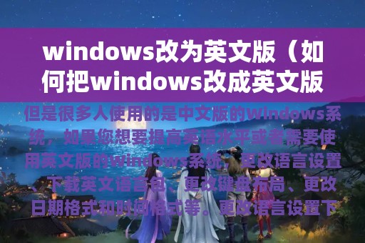 Windows操作系统是全球最流行的操作系统,但是很多人使用的是中文版的Windows系统,如果您想要提高英语水平或者需要使用英文版的Windows系统,那么本文将为您介绍如何将Windows系统改为英文版。本文将从以下几个方面进行介绍:更改语言设置、下载英文语言包、更改键盘布局、更改日期格式和时间格式等。