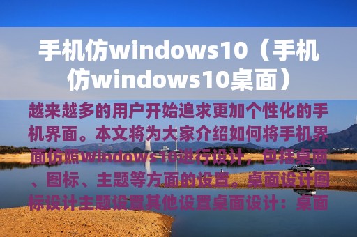随着智能手机的不断发展,越来越多的用户开始追求更加个性化的手机界面。仿Windows10界面的手机应运而生,其简洁、美观的设计风格备受用户喜爱。本文将为大家介绍如何将手机界面仿照Windows10进行设计,包括桌面、图标、主题等方面的设置。接下来,我们将深入探讨这些内容。