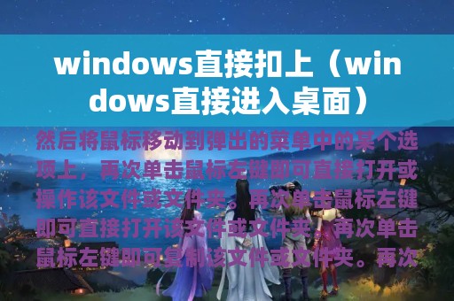 Windows直接扣上是指在Windows操作系统中,通过鼠标右键单击文件或文件夹,然后将鼠标移动到弹出的菜单中的某个选项上,再次单击鼠标左键即可直接打开或操作该文件或文件夹。