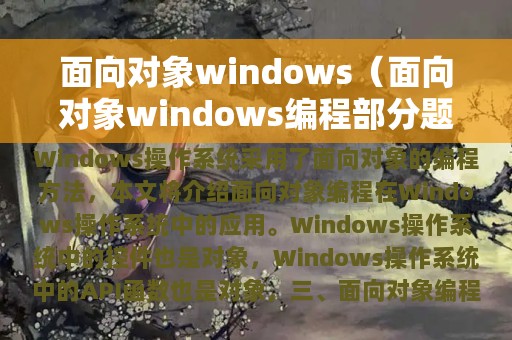 Windows操作系统采用了面向对象编程,使得操作系统更加稳定和易于维护。Windows操作系统中的面向对象编程主要体现在以下几个方面: