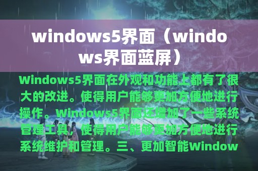 Windows 5界面是Windows操作系统的一代界面,它在外观和功能上都有了很大的改进。Windows 5界面采用了更加现代化的外观,同时在稳定性和智能化方面也有了很大的提升。Windows 5界面的出现,为Windows操作系统的发展奠定了坚实的基础。