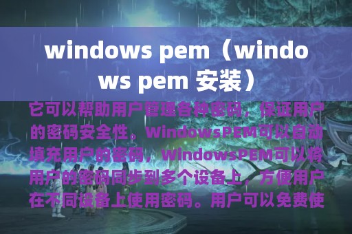 Windows PEM是一款基于Windows操作系统的密码管理软件,它可以帮助用户管理各种密码,包括网站登录密码、银行卡密码、邮箱密码等等。