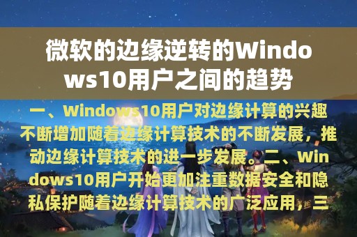 微软的Windows10在边缘计算领域的逆转已经引起了用户的广泛关注。在这个快速发展的领域中,Windows10用户之间的趋势也在不断变化。本文将探讨这些趋势,以及它们对未来的影响。