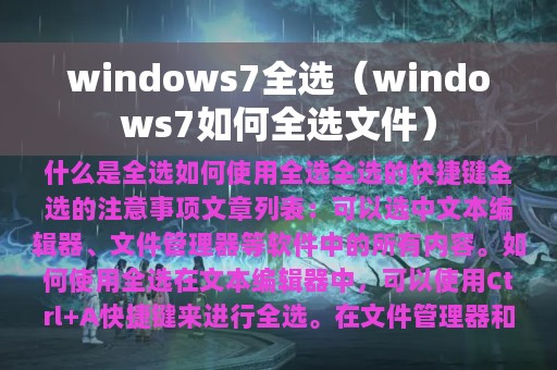 在 Windows 7 操作系统中,全选功能是一个非常常用的操作,能够大大提高我们的工作效率。本文将围绕 Windows 7 的全选功能进行详细介绍,包括大纲目录和内容要点,帮助您更好地掌握全选技巧。