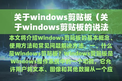 Windows剪贴板是Windows操作系统中的一个功能,它允许用户将文本、图像和其他数据从一个应用程序复制到另一个应用程序中。剪贴板可以存储多个数据项,但一次只能复制一个数据项。