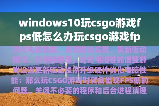 如果你的电脑性能不够强大,那么玩CSGO游戏时就会出现FPS低的问题。因此,你需要优化电脑性能。以下是一些方法: