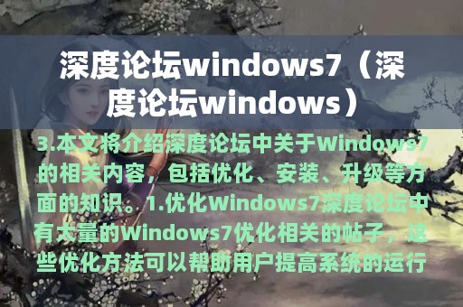 3. 本文将介绍深度论坛中关于Windows 7的相关内容,包括优化、安装、升级等方面的知识。