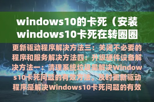 本文介绍了Windows10卡死的原因和解决方法,包括清理系统垃圾、更新驱动程序、关闭不必要的程序和服务以及升级硬件设备。希望本文能够帮助大家解决Windows10卡死问题,更好地使用Windows10。