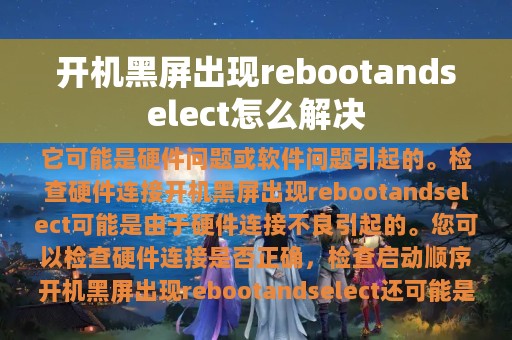 开机黑屏出现rebootandselect可能是由于硬件连接不良、启动顺序设置错误或操作系统损坏引起的。您可以通过检查硬件连接、检查启动顺序或修复操作系统来解决这个问题。如果以上方法无法解决,建议您联系专业维修人员。