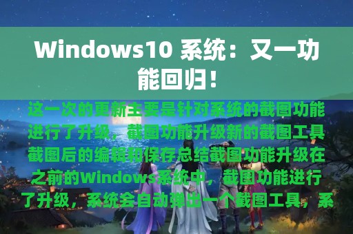 Windows10 系统又有一项功能回归了!这一次的更新主要是针对系统的截图功能进行了升级,让用户在使用系统时更加方便快捷。下面是本文的大纲目录: