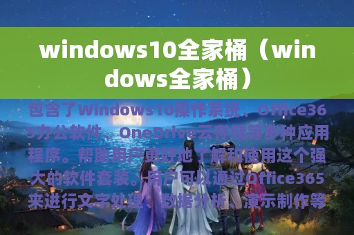 Windows 10全家桶是微软公司推出的一套软件套装,包含了Windows 10操作系统、Office 365办公软件、OneDrive云存储等多种应用程序。本文将介绍Windows 10全家桶的主要功能和使用方法,帮助用户更好地了解和使用这个强大的软件套装。