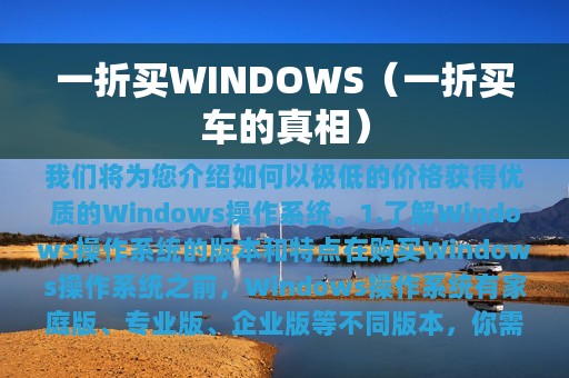 购买Windows操作系统的过程中,需要了解不同版本的特点和功能、选择可靠的购买渠道、选择适合自己的版本以及注意安装和激活。通过以上步骤,你可以以极低的价格获得优质的Windows操作系统。