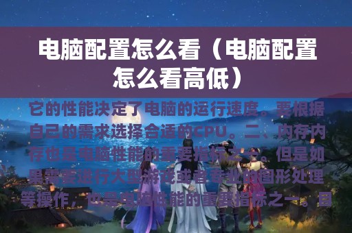 电脑配置是决定电脑性能的重要因素,其中CPU、内存、硬盘和显卡是最重要的指标。在购买电脑时,要根据自己的需求选择合适的配置,以获得更好的使用体验。