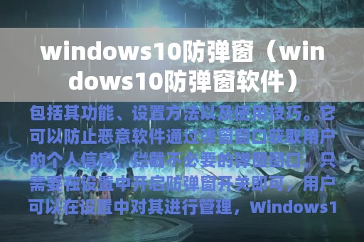 Windows 10防弹窗是一种弹窗拦截程序,可以阻止不必要的弹窗窗口,从而保护用户的隐私安全。它可以防止恶意软件通过弹窗窗口获取用户的个人信息,同时也可以减少广告弹窗的干扰。