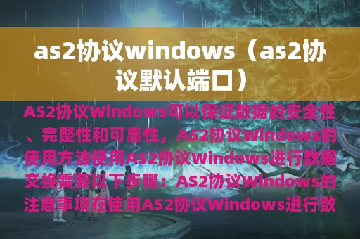 AS2协议Windows是一种应用于网络通信的协议,它可以在Windows系统上实现数据的传输和通信。本文将为大家详细介绍AS2协议Windows的相关内容,包括其基本概念、使用方法、以及注意事项等。