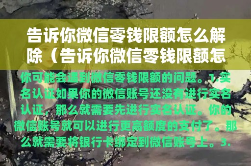 微信零钱是一种非常方便的支付方式,但是在使用过程中,你可能会遇到微信零钱限额的问题。那么,如何解除微信零钱限额呢?下面就来详细了解一下吧。