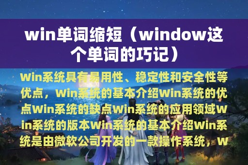 Windows操作系统是一款广泛使用的操作系统,常被简称为Win。Win的缩写来源于Windows,Windows是微软公司推出的一款操作系统。Win系统具有易用性、稳定性和安全性等优点,深受广大用户的喜爱。