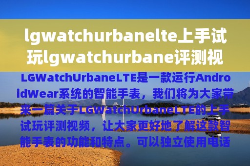 LG Watch Urbane LTE是一款运行Android Wear系统的智能手表,同时支持4G LTE网络。在这篇文章中,我们将为大家带来一篇关于LG Watch Urbane LTE的上手试玩评测视频,让大家更好地了解这款智能手表的功能和特点。