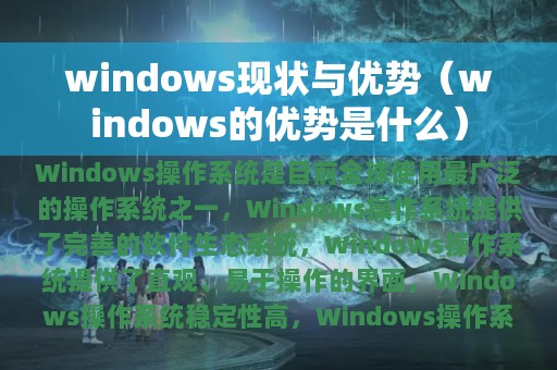 Windows操作系统是目前全球使用最广泛的操作系统之一,其市场占有率超过80%。Windows操作系统提供了直观、易于操作的界面,稳定性高、安全性好、兼容性强、可定制性高等优势,为用户提供了全方位的使用体验。