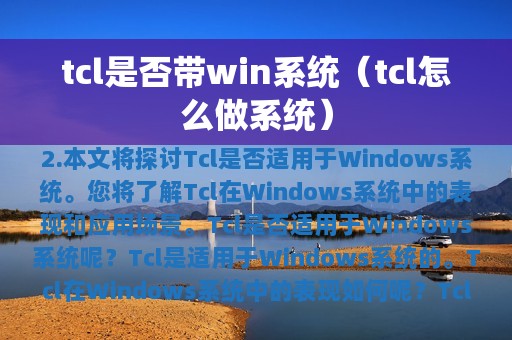 2. 本文将探讨Tcl是否适用于Windows系统。