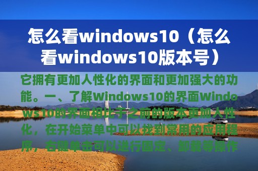 Windows10是微软推出的最新操作系统,它拥有更加人性化的界面和更加强大的功能。但是很多人对于Windows10的使用还存在一些困惑,本文将为大家介绍如何看Windows10。