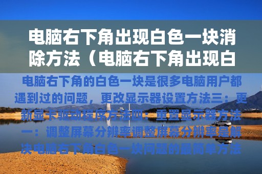 消除电脑右下角的白色一块问题,可以通过调整屏幕分辨率、更改显示器设置、更新显卡驱动程序和重置显示器等方法来实现。用户可以根据自己的实际情况选择适合自己的方法。
