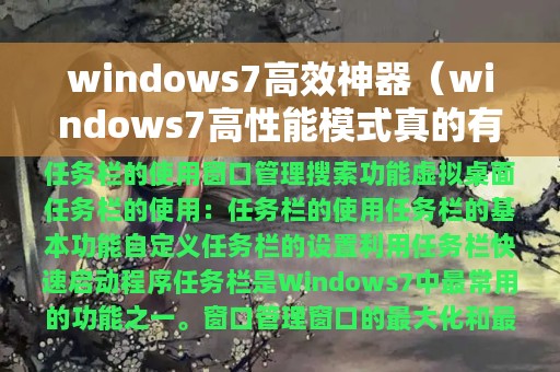 随着计算机技术的不断发展,Windows 7已成为一款备受欢迎的操作系统。它具有许多强大的功能,可以使用户更高效地使用计算机。本文将介绍Windows 7的一些高效神器,帮助你更好地利用这个操作系统。