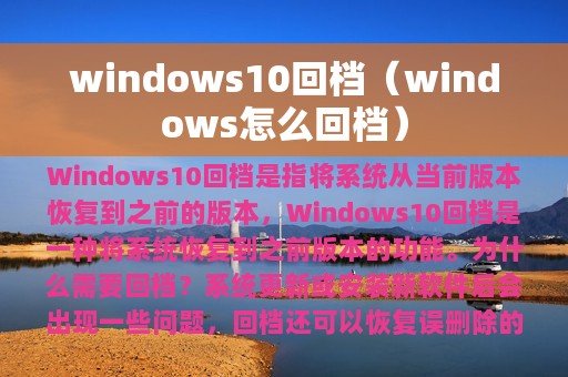Windows 10 回档是一种将系统恢复到之前版本的功能。这可以帮助用户解决一些系统问题,比如更新失败、软件不兼容等。