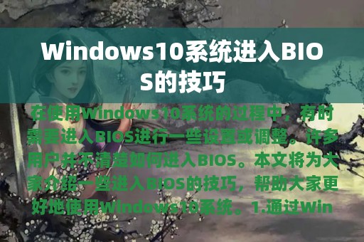 在使用Windows10系统的过程中,有时需要进入BIOS进行一些设置或调整。但是,许多用户并不清楚如何进入BIOS。本文将为大家介绍一些进入BIOS的技巧,帮助大家更好地使用Windows10系统。