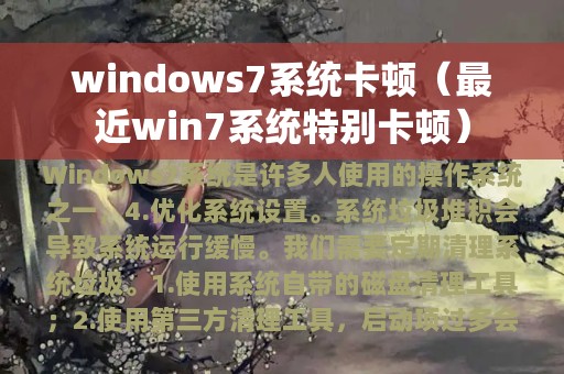 Windows 7系统是许多人使用的操作系统之一,但有时候会出现卡顿现象,影响使用体验。本文将围绕Windows 7系统卡顿问题展开,为大家提供解决方案和优化建议。大纲目录包括:1.清理系统垃圾;2.关闭不必要的启动项;3.升级硬件配置;4.优化系统设置。接下来,我们将详细讲解这些内容。
