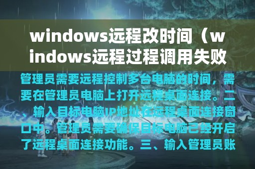 总结:通过远程桌面连接,管理员可以方便地远程控制目标电脑的时间和日期。这种方法适用于需要同步多台电脑时间的组织,如公司或学校等。管理员只需要打开远程桌面连接,输入目标电脑的IP地址和管理员账户名密码,然后更改时间和日期设置即可。