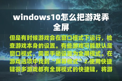 Windows 10是目前最流行的操作系统之一,很多人在上面玩游戏。但是有时候游戏会在窗口模式下运行,这就影响了游戏体验。那么该怎么把游戏弄全屏呢?下面我们来一起看看吧!