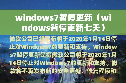 Windows 7暂停更新是指微软公司将于2020年1月14日停止对Windows 7的更新和支持。这意味着,微软将不再发布新的安全更新、修复程序和功能更新,这将使Windows 7变得更加容易受到安全漏洞的攻击。