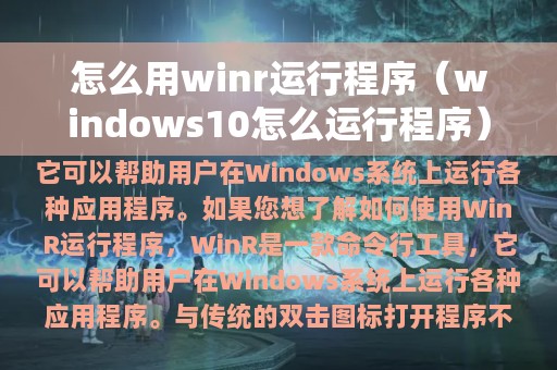 WinR是一款运行程序的工具,它可以帮助用户在Windows系统上运行各种应用程序。如果您想了解如何使用WinR运行程序,本篇文章将为您提供详细的指导。