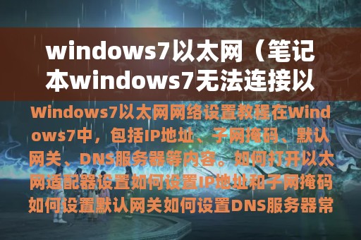 在Windows 7中,以太网网络是最常用的网络连接方式之一。本文将为您详细介绍如何设置Windows 7以太网网络,包括IP地址、子网掩码、默认网关、DNS服务器等内容。同时,我们还将为您提供一些常见问题的解决方法,帮助您更好地使用Windows 7以太网网络。
