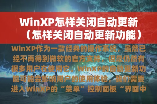 WinXP作为一款经典的操作系统,虽然已经不再得到微软的官方支持,但是仍然有很多用户在使用它。然而,WinXP的自动更新功能可能会影响用户的使用体验,那么如何关闭自动更新呢?本文将为大家介绍具体的操作方法。