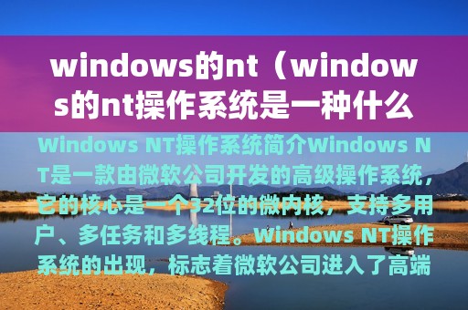 Windows NT是一款由微软公司开发的高级操作系统,它的核心是一个32位的微内核,支持多用户、多任务和多线程。Windows NT操作系统的出现,标志着微软公司进入了高端服务器市场,成为了服务器操作系统的主流之一。