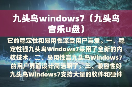 九头鸟Windows7是一款功能强大、稳定性高、易用性好、兼容性强、安全性高的操作系统。它的出现为用户提供了更加便利的计算环境,深受用户喜爱。