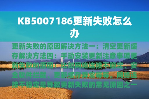 KB5007186是微软发布的一项重要更新,但是有些用户在更新时会遇到失败的情况,导致无法正常安装。本文将围绕着KB5007186更新失败的情况,为大家提供解决方法和注意事项。本文将从以下几个方面进行介绍: