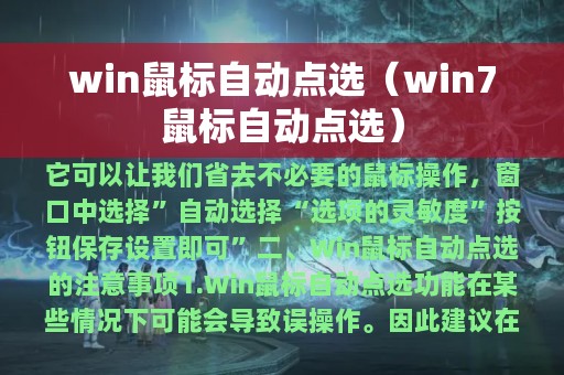 1. Win鼠标自动点选功能在某些情况下可能会导致误操作,因此建议在使用时谨慎操作。