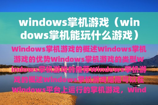 Windows掌机游戏是指可以在Windows平台上运行的掌机游戏,它们通常具有便携性和易于游戏的特点。这些游戏可以在掌上电脑、平板电脑等设备上运行,也可以通过连接电视来进行游戏。Windows掌机游戏已经成为了一种非常受欢迎的娱乐方式。