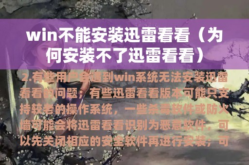 1. 迅雷看看无法安装可能是由于操作系统不兼容、安全软件拦截、系统文件损坏或硬件配置不足等原因导致;