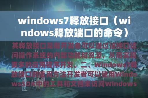 Windows 7是微软公司推出的一款操作系统,其释放接口是指开发者可以通过该接口访问操作系统的内部功能和资源,从而实现更多的应用程序开发。本文将介绍Windows 7的释放接口,包括其特点、使用方法和应用场景。