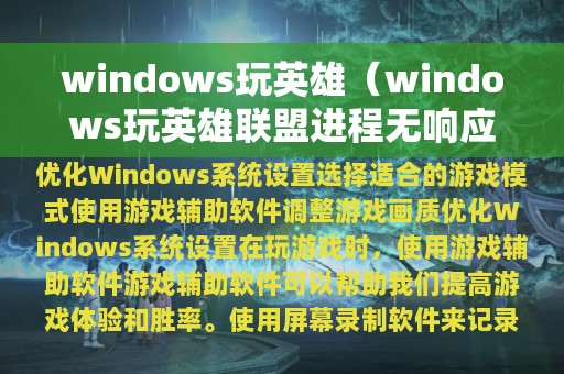 通过优化Windows系统设置、选择适合的游戏模式、使用游戏辅助软件和调整游戏画质等方式,我们可以提高Windows玩英雄的游戏体验和胜率。希望本文能够对大家有所帮助。