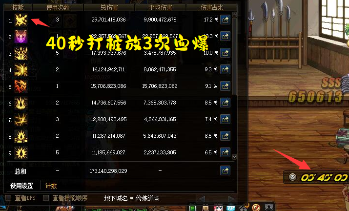 这里先看一张打桩伤害图,40秒修炼场,因为是测试装备,伤害比较低姑且不谈,比较亮眼的地方在于,这里40秒竟然打了3个血爆,这是常规搭配无法做到的,那么这是如何实现的呢?